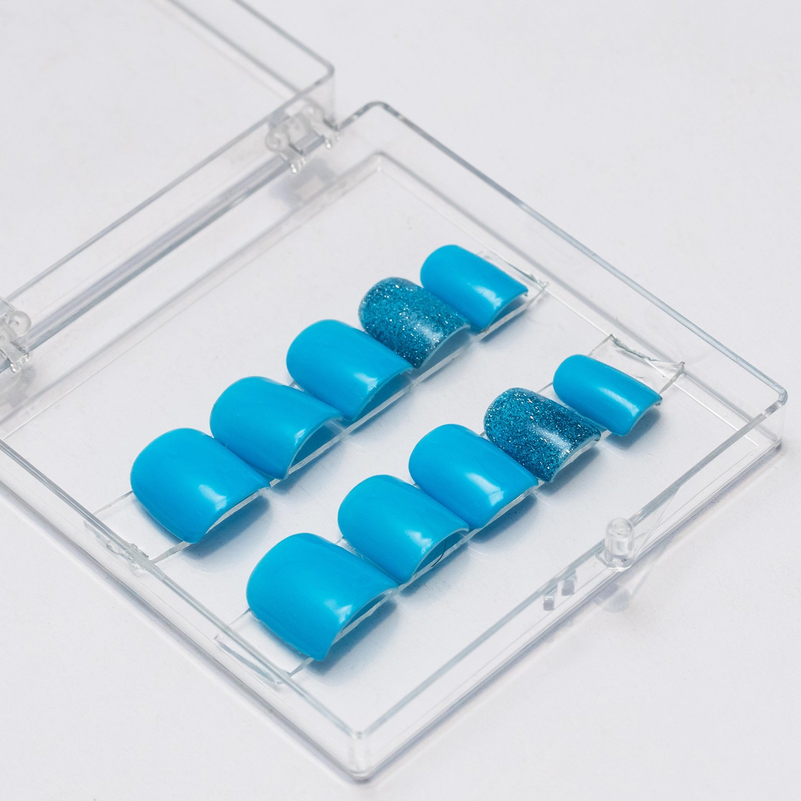 Aqua Twinkle Press-On Nails Bring a touch of sparkle and elegance with Aqua Twinkle Press-On Nails. These beautiful blue nails have a solid color with a pop of blue glitter on select fingers, making them perfect for adding a little extra shine to your look. Whether you're heading to a party, a wedding, or just want to feel glamorous, these nails will make your hands shine with every gesture. Where to Use: Perfect for special occasions like birthdays, night outs, or even everyday wear to add some sparkle to your look. The unique design of blue with glitter makes it a standout choice for anyone who loves a bit of shine!