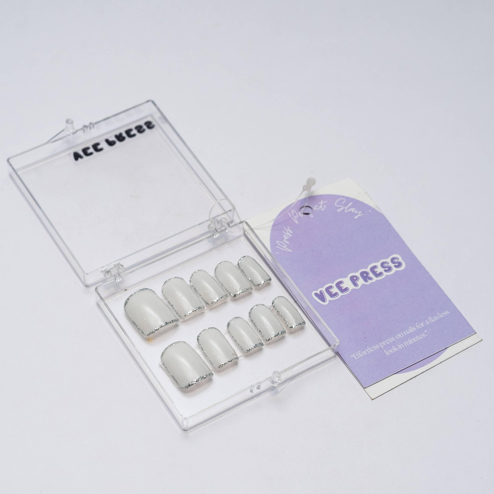 Borderline Glitter Press-Ons Get that everyday glam with our Borderline Glitter press-on nails. These milky white nails feature a touch of sparkle around the corners, giving you a chic and subtle glitter look. Whether you're heading to work, a casual outing, or a dinner date, these nails will add just the right amount of shine without being too bold. How to Use: Start by cleaning your nails to remove any oils or dirt. Select the press-on that fits each finger, and gently peel off the backing. Press the nail firmly onto your natural nail, making sure it’s snug and secure. Repeat for all nails, and enjoy your instant glam! Where to Use: Perfect for daily wear, these nails are ideal for work, social events, or whenever you want to feel effortlessly stylish. Easy to apply and comfortable to wear, they’re great for adding that touch of sparkle to any outfit.