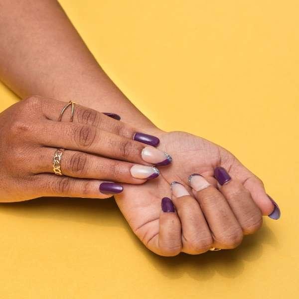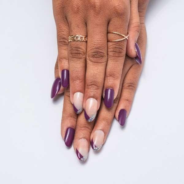Elevate your everyday look with a sophisticated twist. These nails feature a deep wine-toned French tip, blending elegance with a hint of boldness. The French style is reimagined with rich burgundy hues and a subtle touch of glitter, adding just the right amount of sparkle for a glamorous, yet wearable finish. Perfect for daily wear with a luxe vibe, these nails strike the balance between chic and effortless glam.