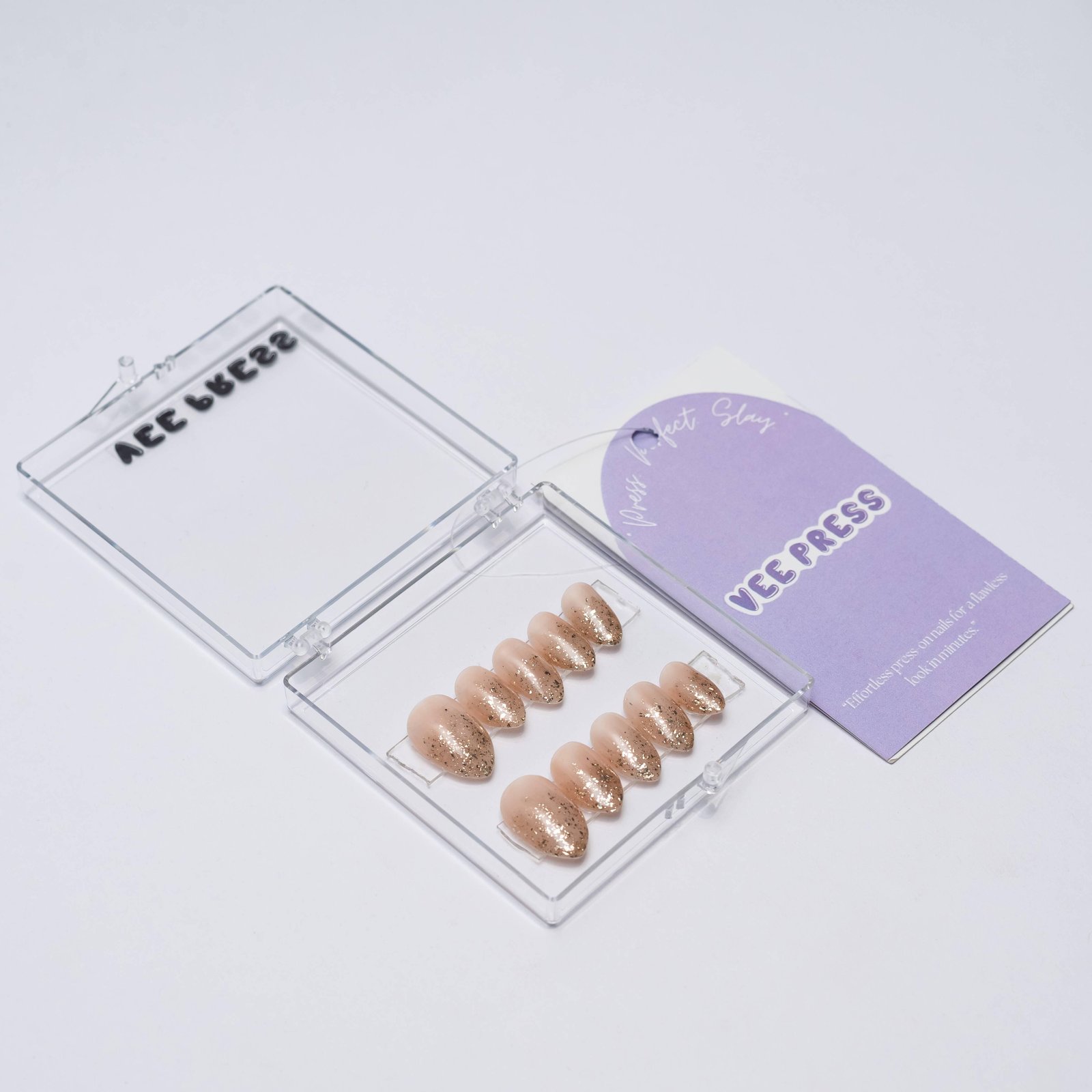 Falling Glitter Press-On Nails Add a touch of sparkle and elegance to your look with our Falling Glitter press-on nails. These nails feature a stunning nude brown base, adorned with beautiful golden glitter that falls delicately for a sparkling effect. Perfect for any occasion, whether you're heading to a party, wedding, or just want to add some glam to your everyday style! Where to Use: Perfect for special occasions like weddings, birthdays, or holidays. Great for adding some sparkle to your everyday look. Suitable for both casual and formal events. Get ready to shine with Falling Glitter!