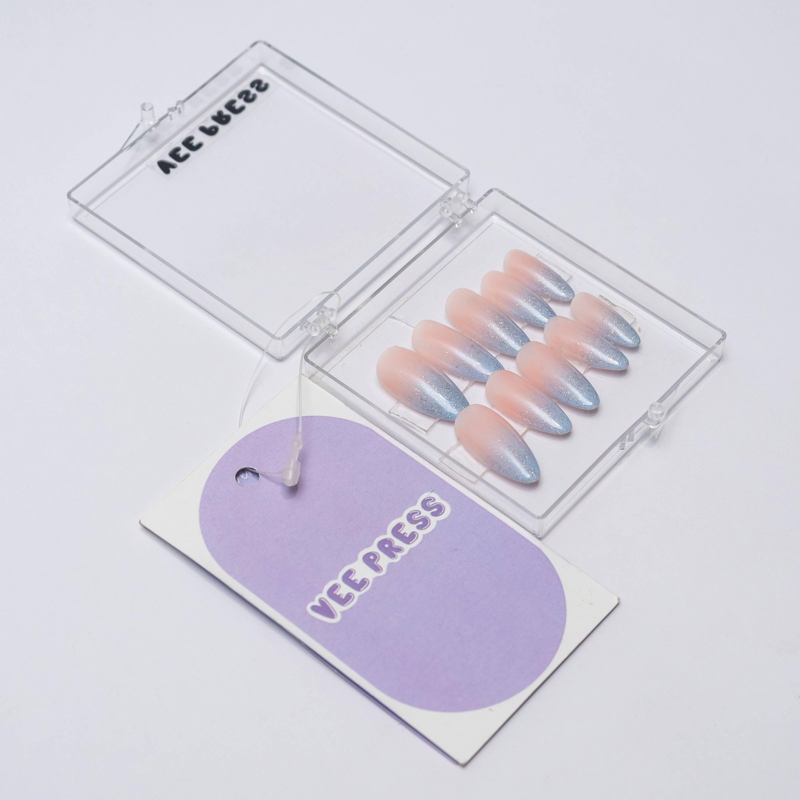 Gender Reveal Press-On Nails Get ready for the big reveal with Vee Nails' Gender Reveal press-on nails. These stylish nails feature a soft pink base that blends seamlessly with your natural skin tone, transitioning into a beautiful blue ombre at the tips. A hint of silver glitter adds just the right sparkle to make your nails shine, making them perfect for a special occasion like a gender reveal party! How to Use: Start with clean, dry nails. Choose the press-on nails that best fit your natural nail size. Gently peel off the backing from the press-on nails. Press each nail firmly onto your natural nail, holding for a few seconds to ensure a secure fit. For extra durability, you can use a clear top coat. Where to Use: Perfect for gender reveal parties, baby showers, or any celebration where you want to add a touch of fun and glamour. These nails are easy to apply and can be worn on any occasion, giving you a flawless, professional look without the hassle.