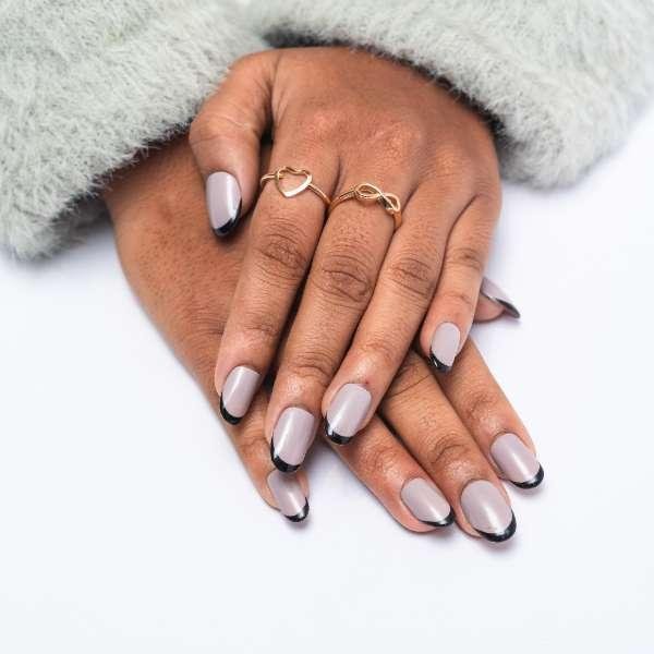Discover the perfect blend of sophistication and style with Ivory Bliss, a stunning press-on nail set designed for those who appreciate understated elegance. This unique design combines a soft ivory base and a bold rusty grey solid base, accentuated by sleek black French tips for a look that's both classic and contemporary.