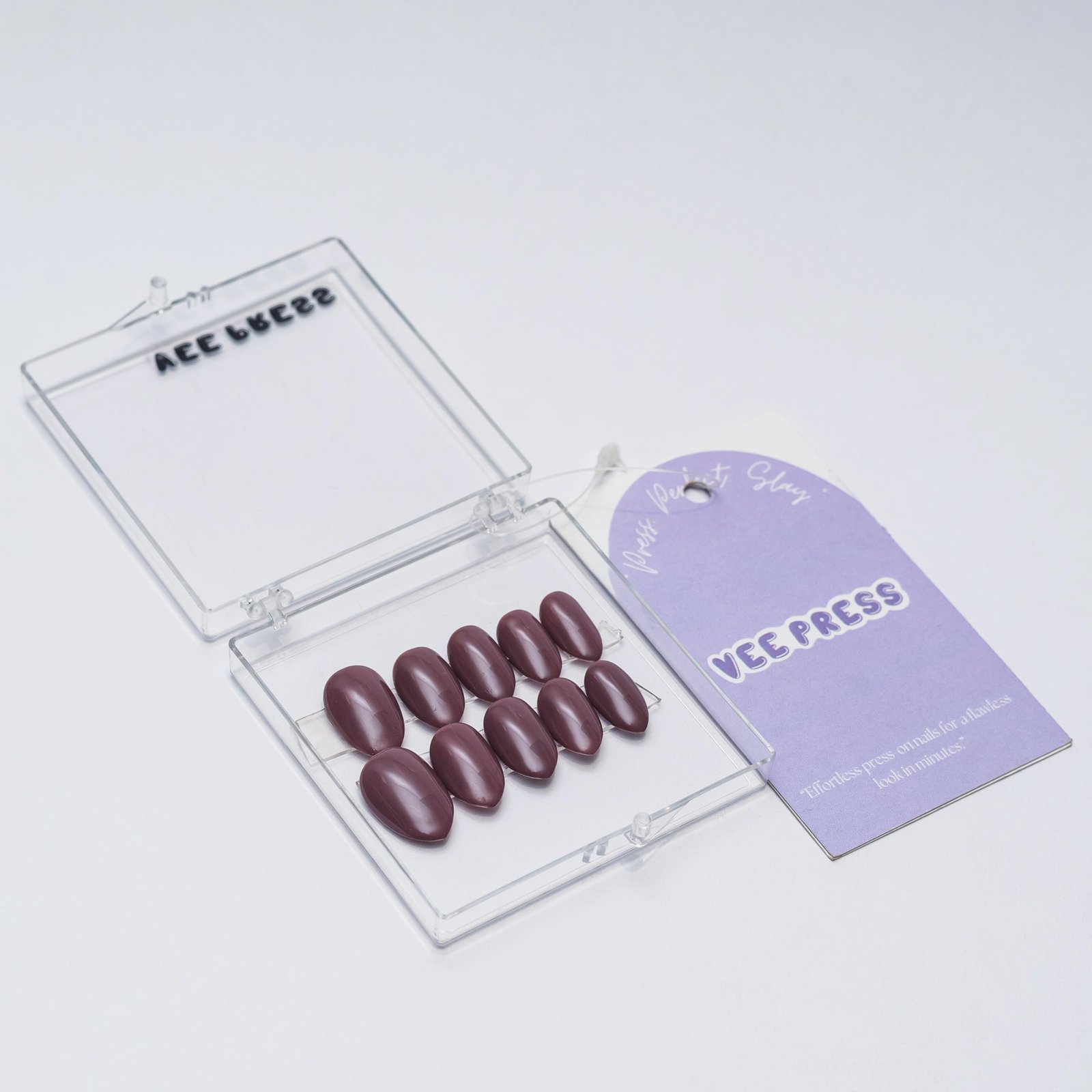 RAISIN PRESS ON NAILS : Our rich and alluring press ons offer a deep , warm purple and brown hue inspired by the deep tones of ripe grapes , this color is perfect for adding a touch of luxurious depth to your look . Whether you're enhancing your wardrobe or dressing up for a special occasion these nails are the perfect choice one can make