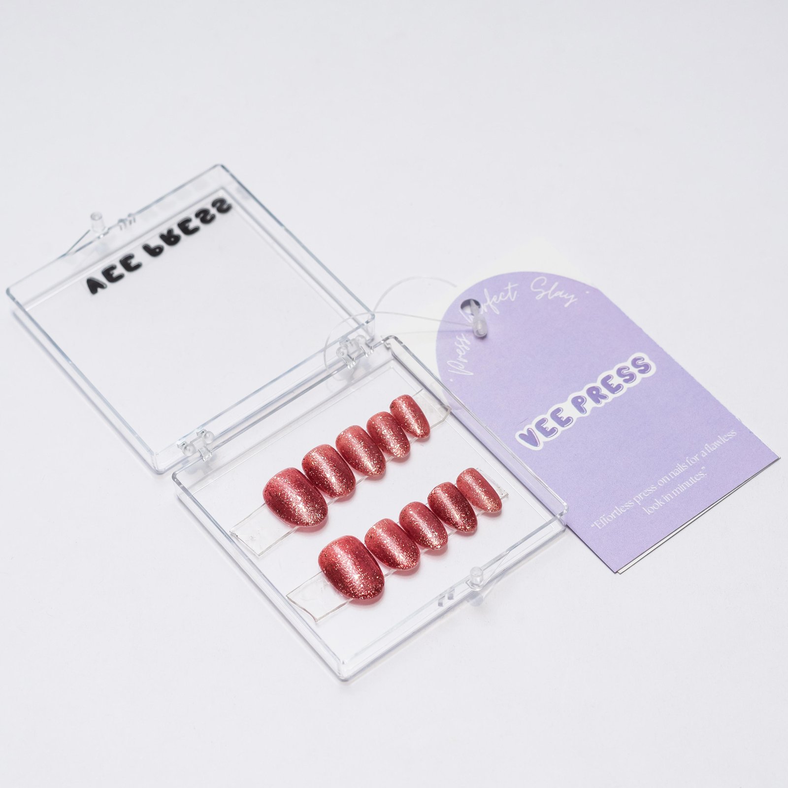 Ruberry Press-On Nails Add some sparkle to your day with Ruberry! These press-on nails feature bold and loud rose gold glitter, perfect for anyone looking to shine. Whether you're attending a party, going out for a special event, or simply want to add a touch of glam to your look, Ruberry nails are the perfect fit. How to Use: Start with clean, dry nails. Choose the right size press-on nails for each finger. Apply the adhesive tabs or glue to the back of each press-on nail. Press the nails onto your natural nails and hold them for a few seconds to ensure they stick properly. Enjoy your gorgeous glitter nails! Where to Use: Ruberry nails are perfect for any occasion that calls for a bit of extra sparkle! Wear them to a wedding, party, date night, or even to brighten up your everyday look. They're also great for photoshoots or any time you want to stand out!
