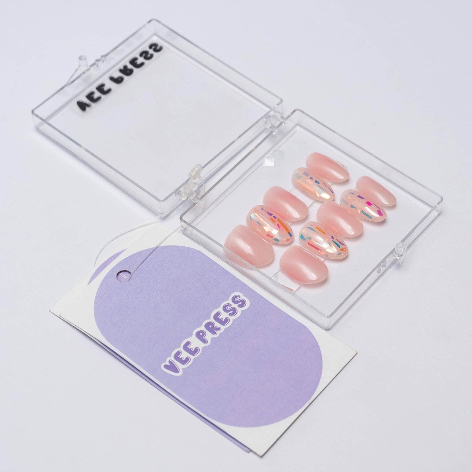 Step into the world of bold elegance with our Shattered Glass press-on nails. Designed for those who love a little extra sparkle and a lot of drama, these nails are here to make a statement. Featuring a soft cotton pink base, paired with an eye-catching shattered glass effect, these nails offer a chic and contemporary twist on your everyday manicure.